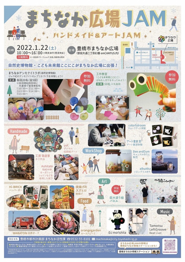 まちなかの新たな「多くの人が集い、交流し、滞在する拠点」として、昨年10月にオープンしたまちなか広場が、みんなで「好きなこと・楽しいこと=JAM」ができる場所、みんなで「集うこと=JAM」ができる場所となり、まちなかの賑わいへと繋がるように、という思いを込めて開催するイベントです。また、まちなか広場から人々の交流が広がるように、まちなかを一緒に盛り上げてくれる仲間と連携して開催します。
