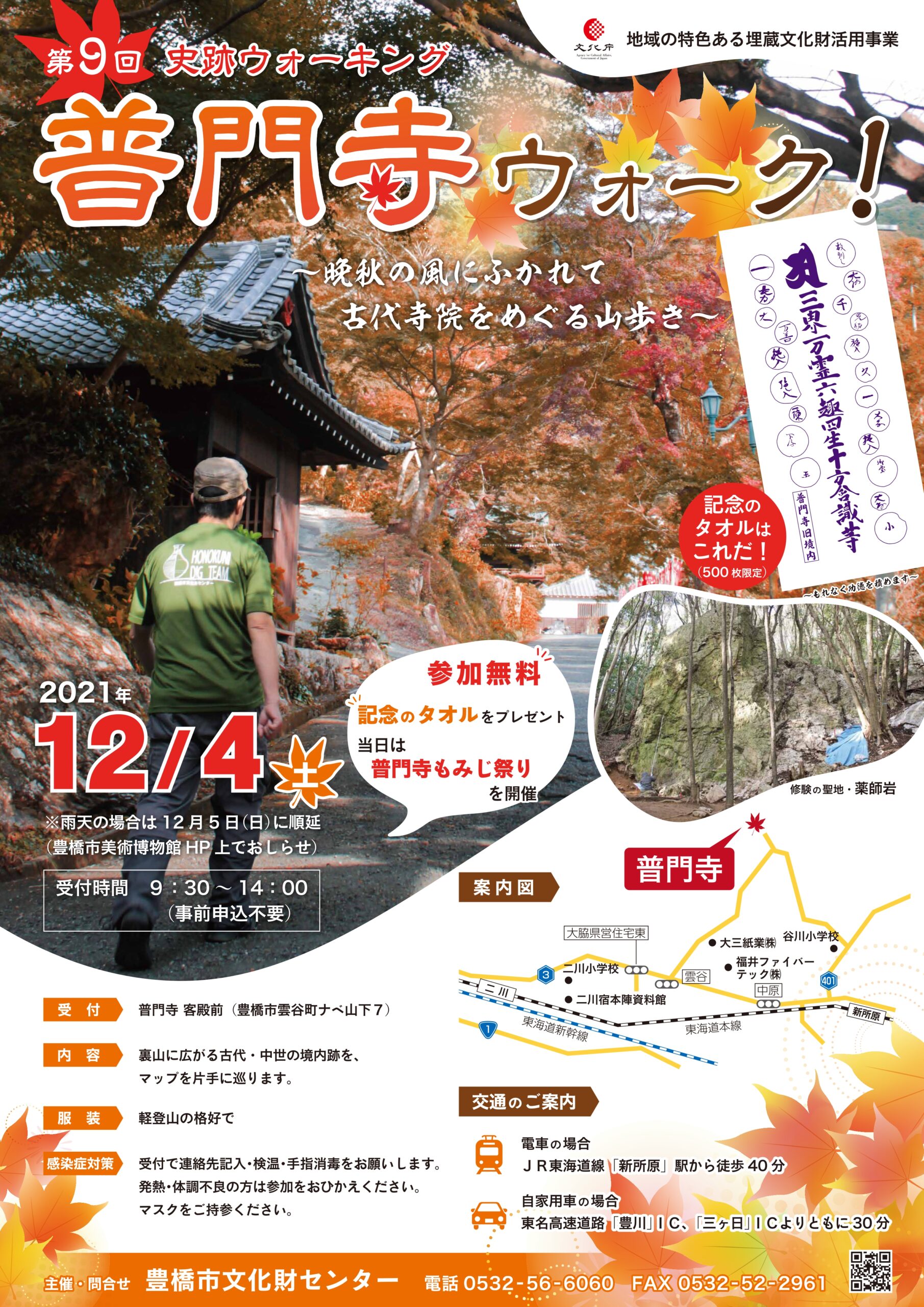 普門寺(豊橋市雲谷町ナベ山下7)と船形山を舞台に、普門寺旧境内の山寺遺構を巡る史跡ウォークを今年も開催します。きれいな紅葉を愛でつつ、古代の信仰にふれる山歩きをお楽しみください。なお、参加者には記念品のタオル(フェイスタオルサイズ)を差し上げます(500枚限定)。