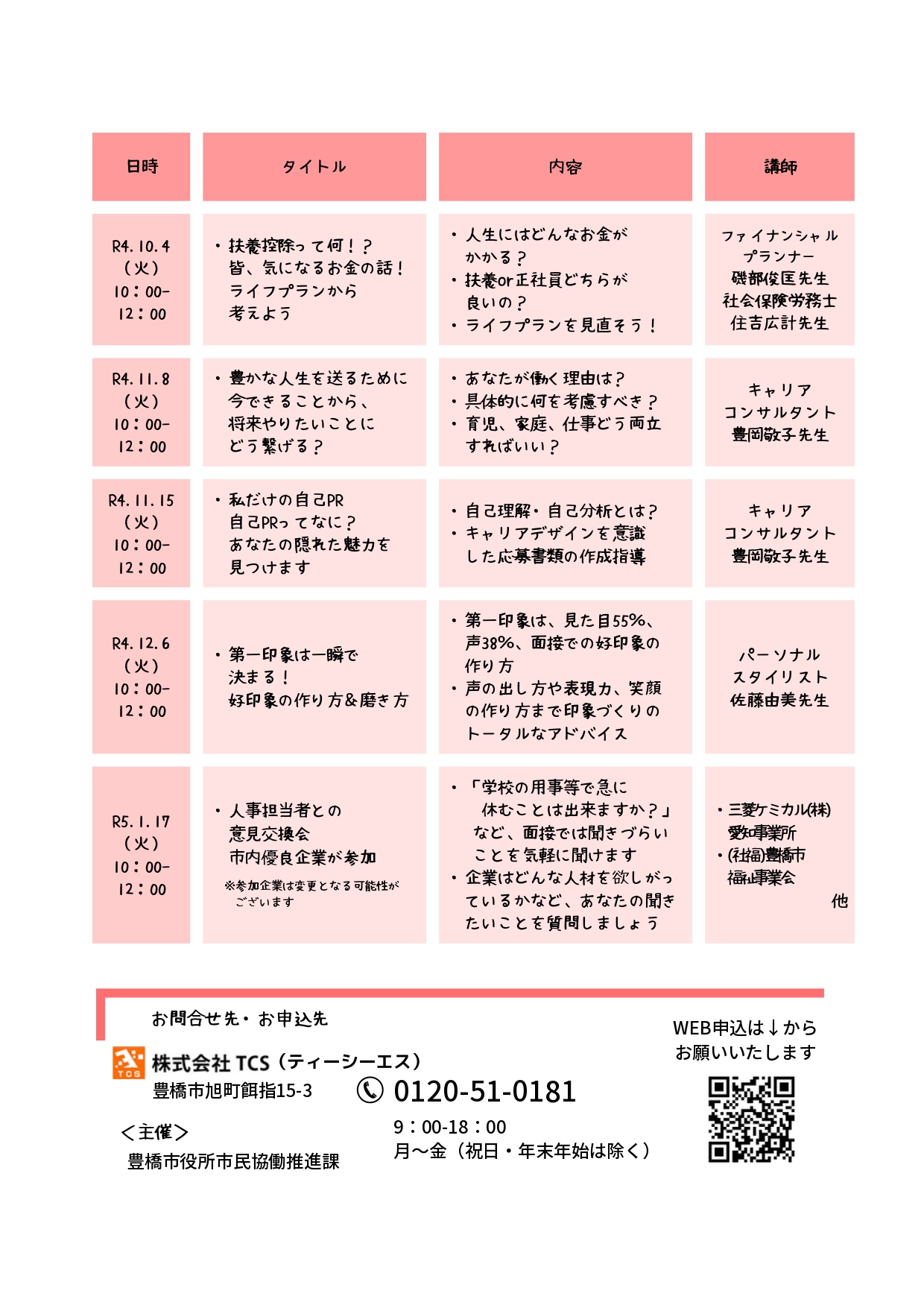 | 日時 | 2022年10月4日(火)、11月8日(火)、11月15日(火)、12月6日(火)、2023年1月17日(火) 時間:全日10:00~12:00 |