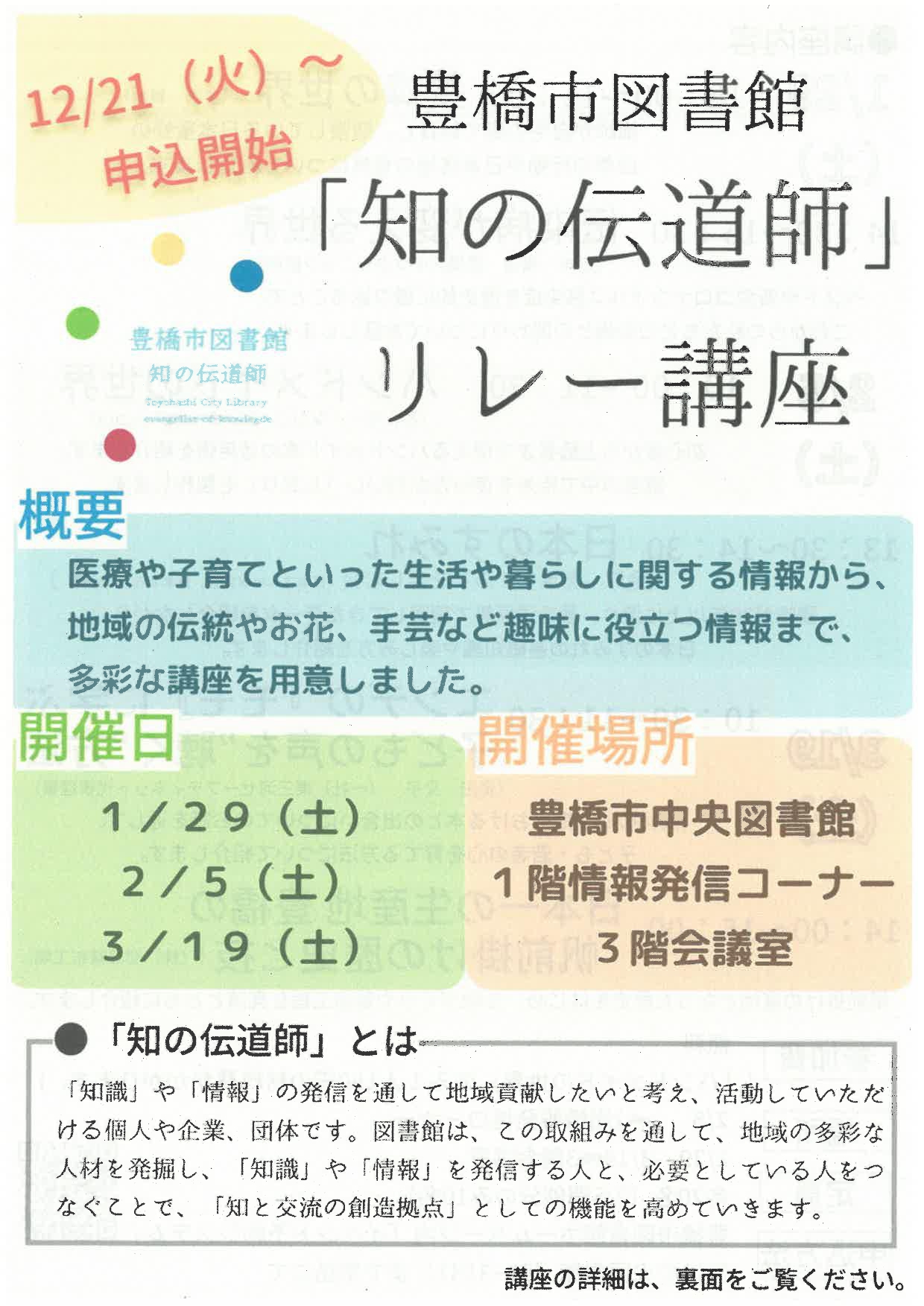 医療や子育てといった生活や暮らしに関する情報から、地域の伝統やお花、手芸など趣味に役立つ情報まで多彩な講座が用意された「豊橋市図書館『知の伝道師』リレー講座」。
