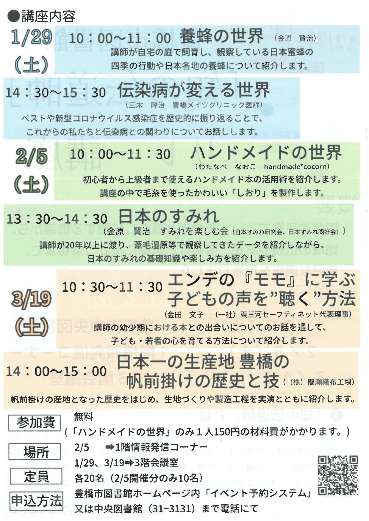 | 申込方法 | 豊橋市図書館ホームページ内イベント予約システムまたは中央図書館に電話にて申込 |