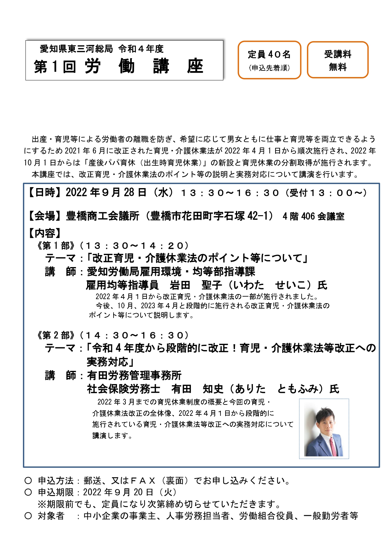 愛知県東三河総局では、労働に関する法律、労務管理などについての基礎的知識を提供することにより、安定した労使関係を形成することを目的として、労働講座を年2回開催しています。