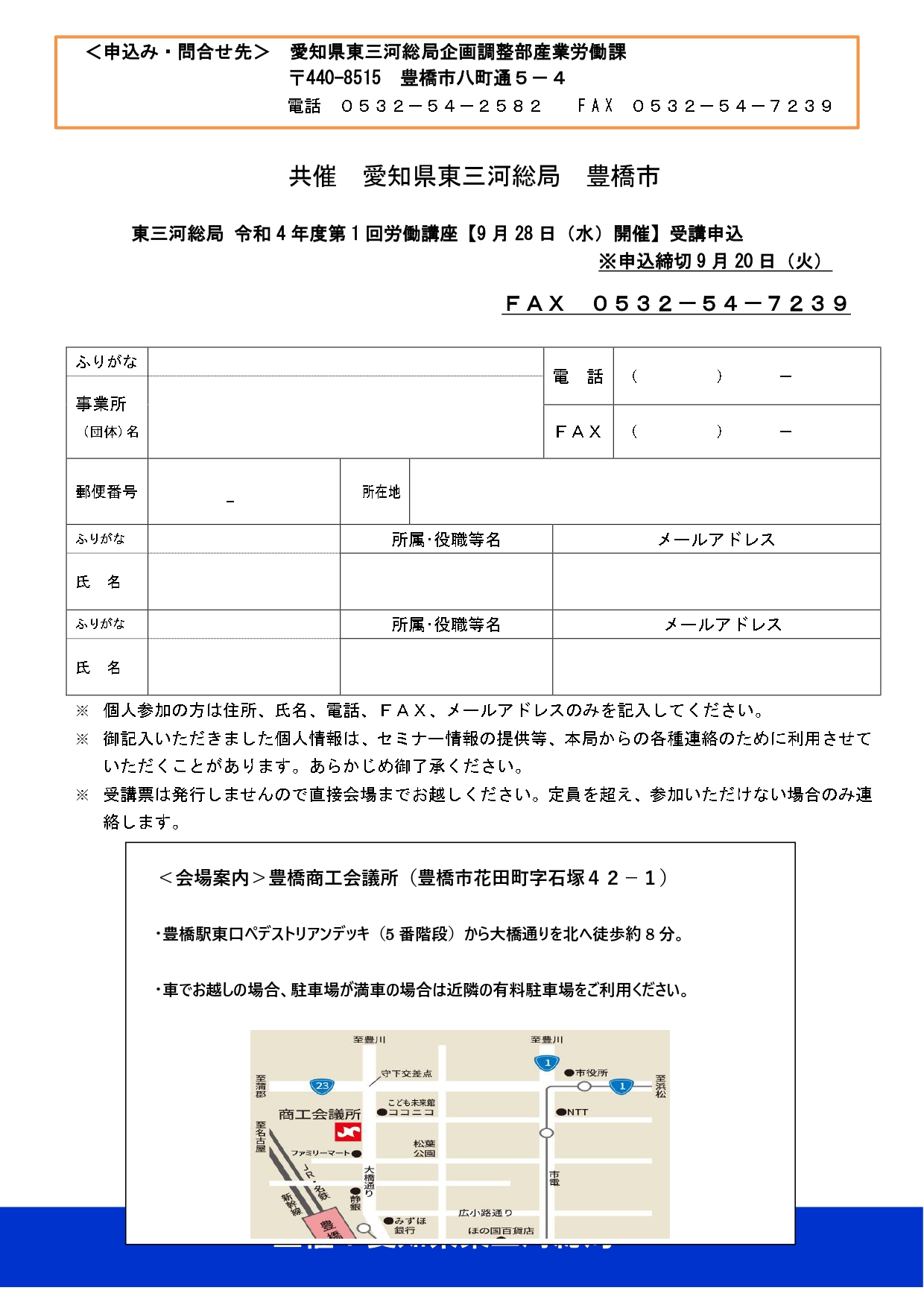 | 申込み | 申込書に必要事項を記入の上、愛知県東三河総局企画調整部産業労働課へFAX又は郵送 9月20日(火)申込締切 |