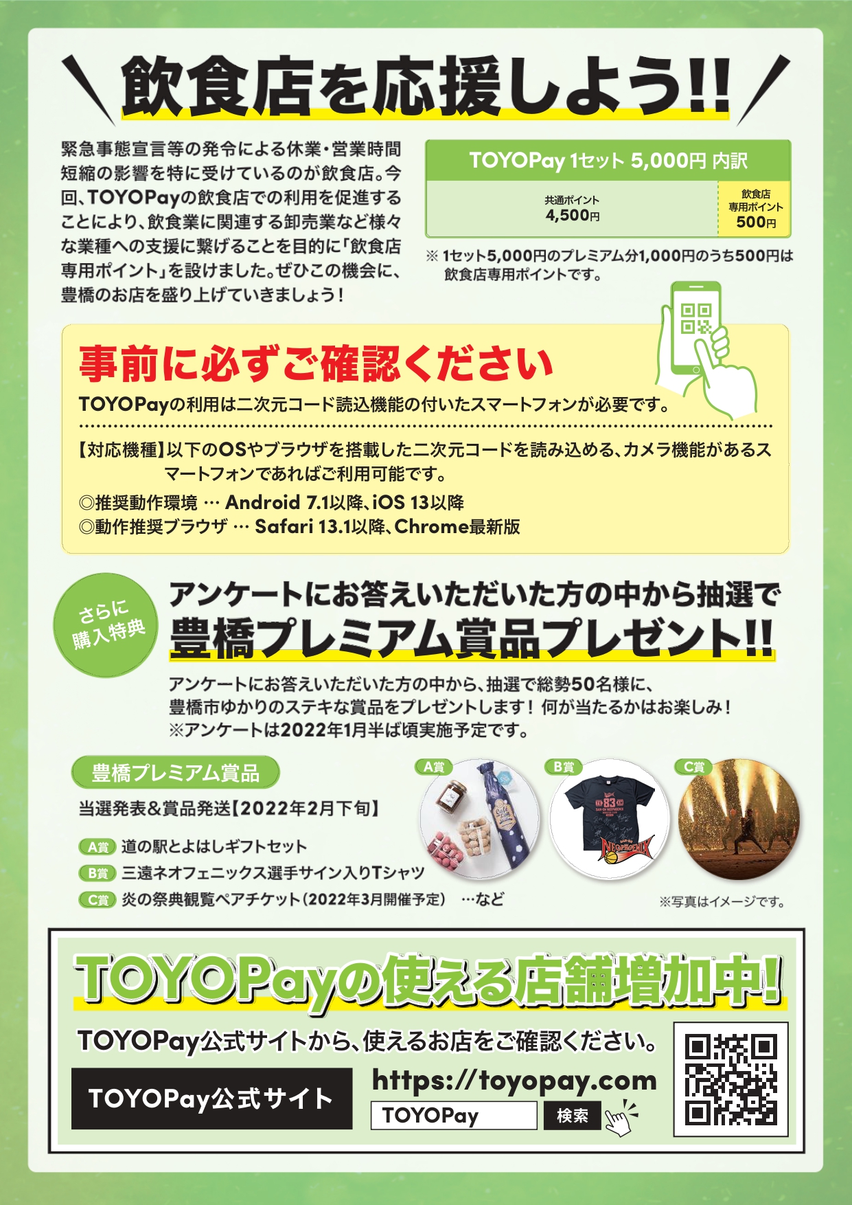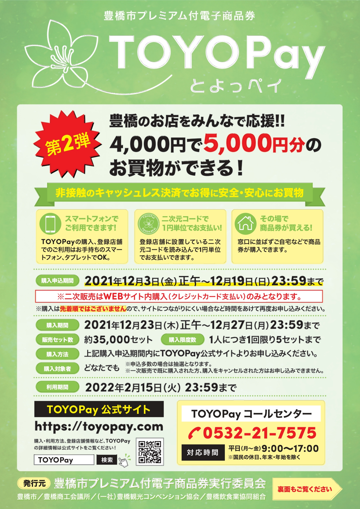 | 発行元 | 豊橋市プレミアム付電子商品券実行委員会 (豊橋市/豊橋商工会議所/(一社)豊橋観光コンベンション協会/豊橋飲食業協同組合) |