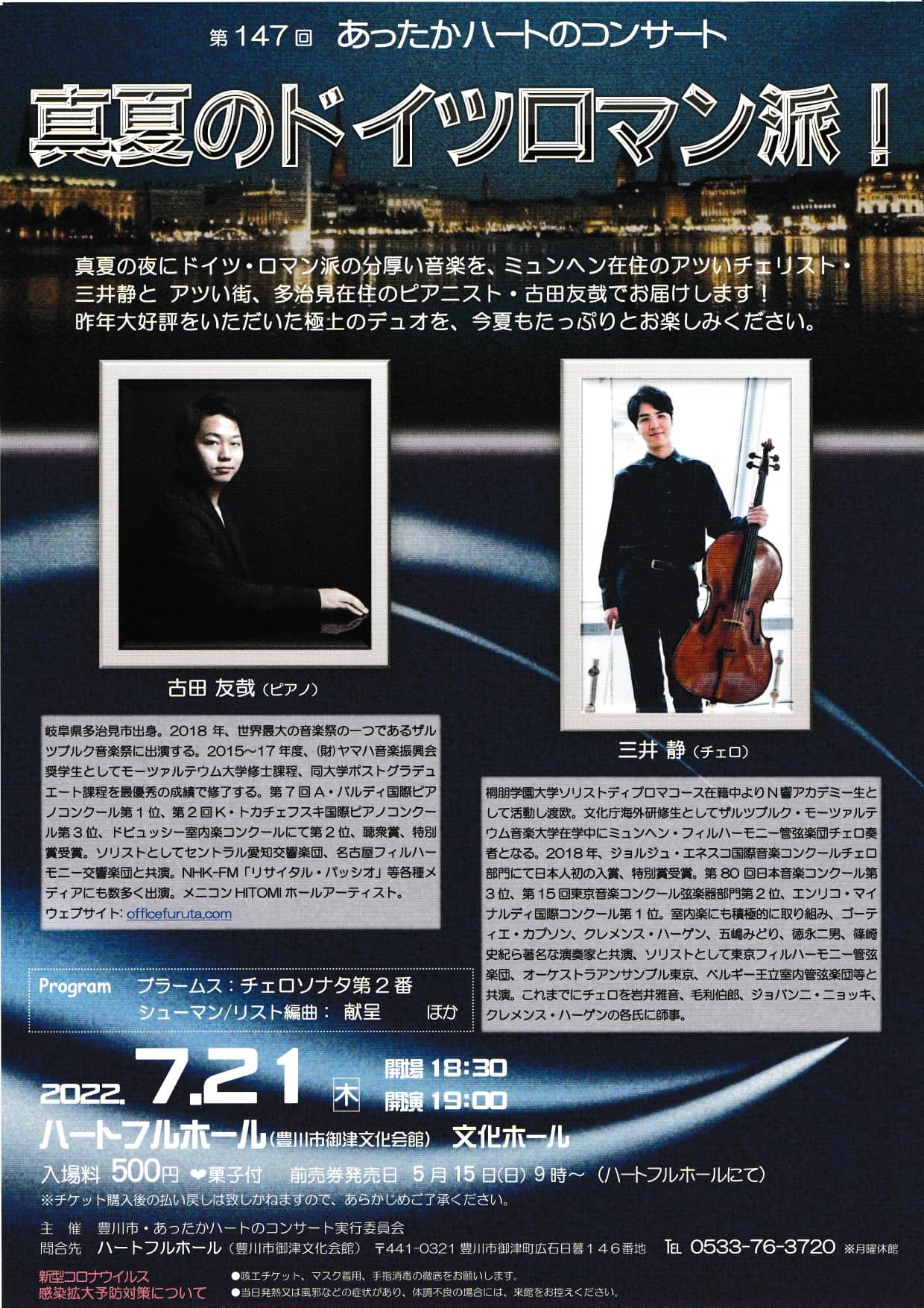 真夏の夜にドイツ・ロマン派の分厚い音楽を、ミュンヘン在住のアツいチェリスト・三井静と アツい街、多治見在住のピアニスト・古田友哉でお届けします!