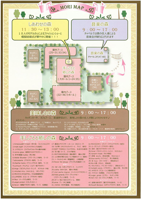 ハンドメイド作品や可愛い小物がいっぱいの“手しごとの森”、キッチンカーや産地直送の野菜などが集まる“美味しさの森”、豪華なウェディングショーなど、1日中楽しめるコンテンツが満載!