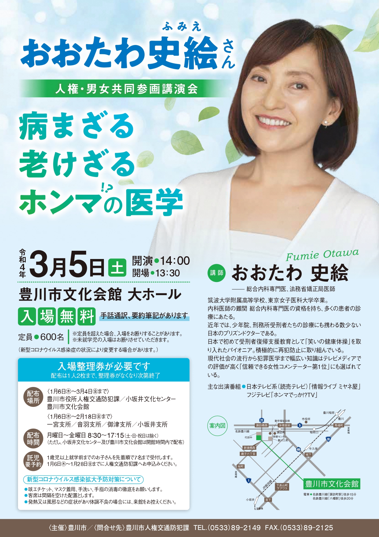 豊川市では、人権尊重思想の普及・高揚と男女共同参画への理解を深めるため、人権・男女共同参画講演会を開催します。