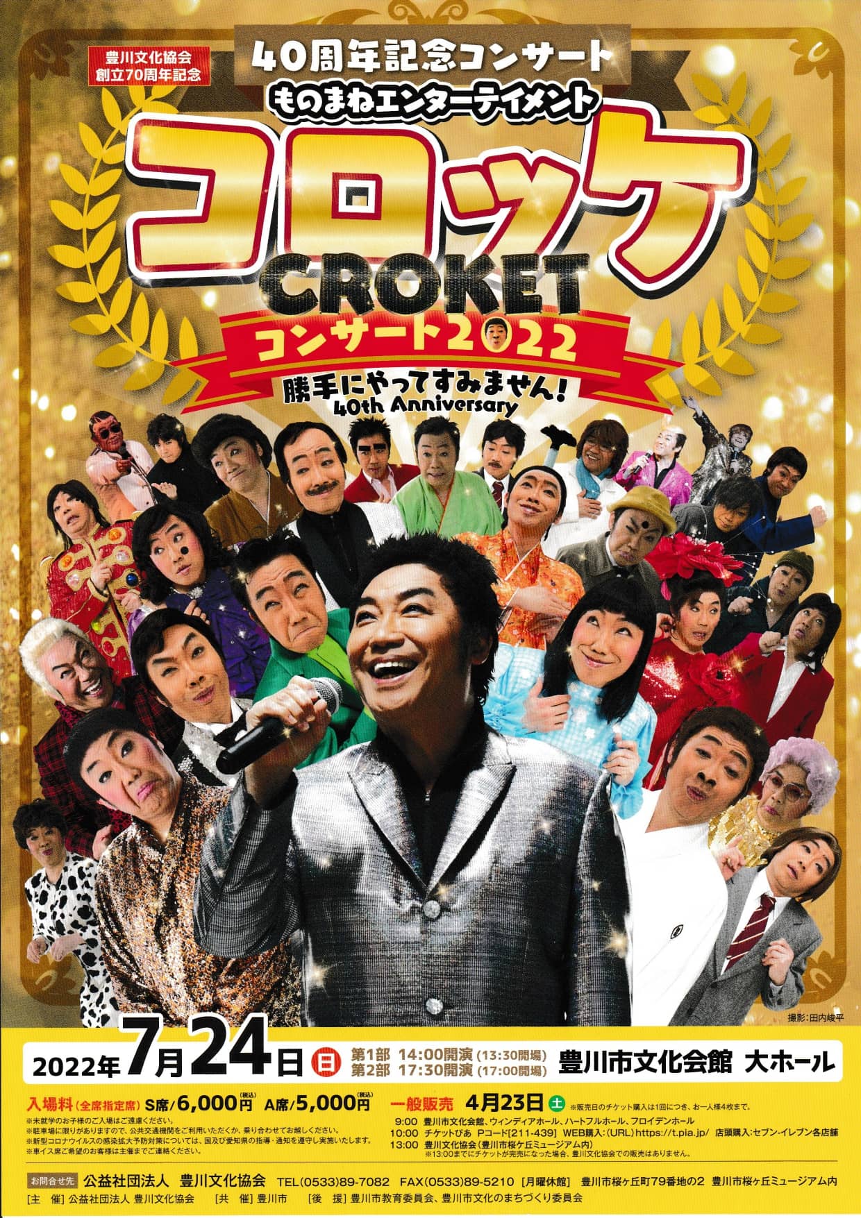 豊川文化協会創立70周年記念として、「ものまね界の帝王」コロッケの芸能生活40周年記念コンサートが豊川市文化会館にて行われます。