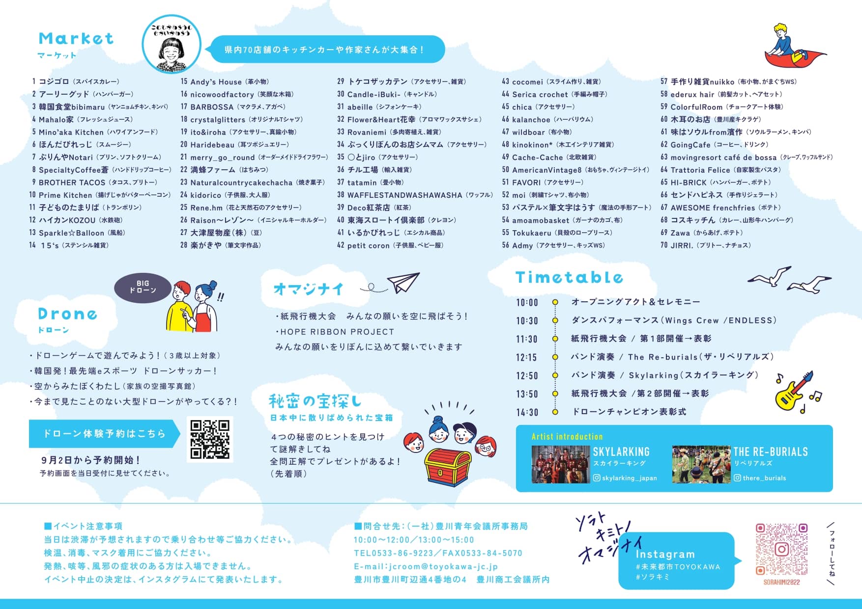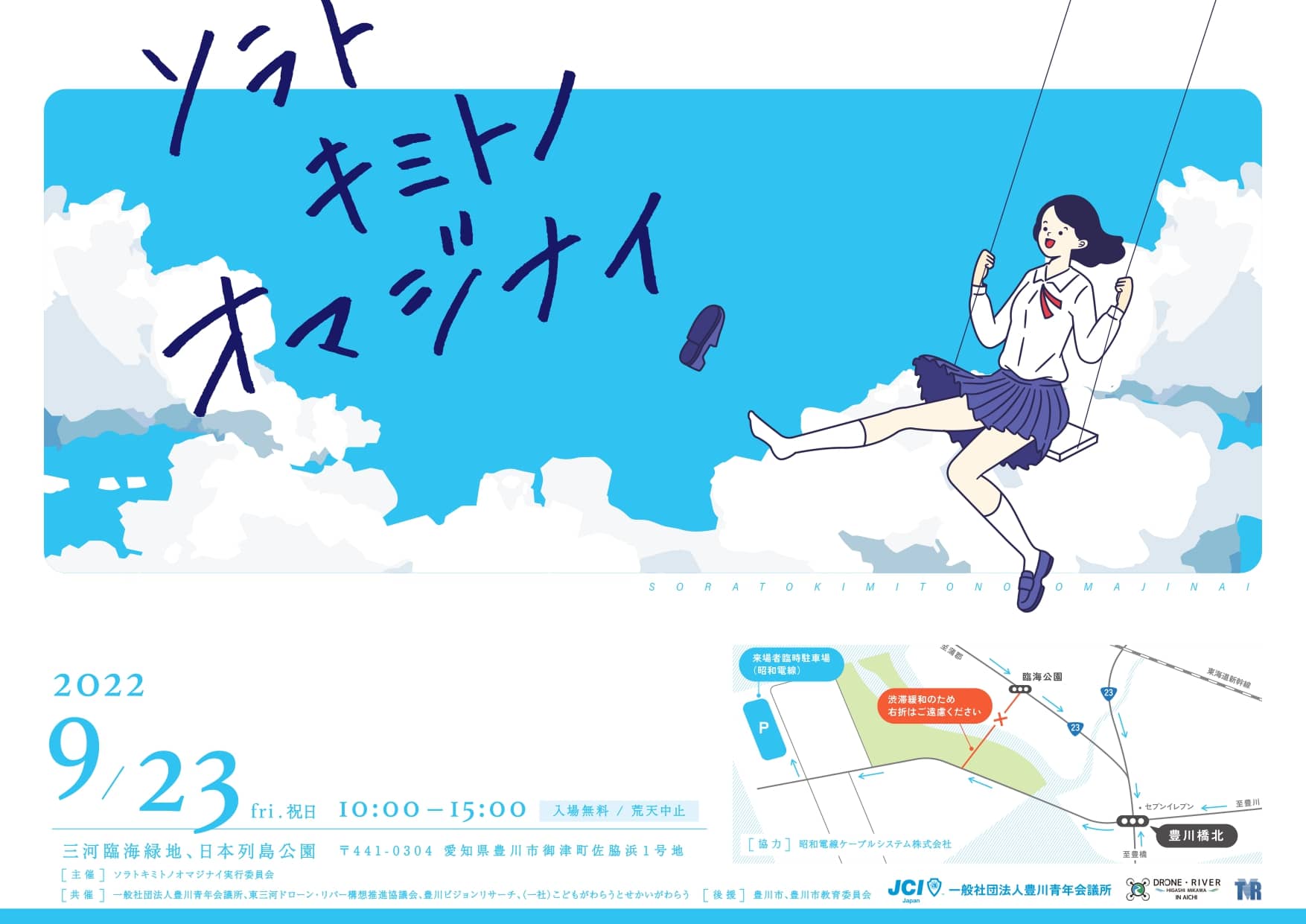 豊川青年会議所では『ソラトキミトノオマジナイ』と題したパートナシップ事業のイベントを開催いたします。豊川青年会議所とビジョンを同じくする団体である「東三河ドローン・リバー構想推進協議会」「こどもがわらうとせかいがわらう」「豊川ビジョンリサーチ」とパートナーシップを結び、ドローン縁日やドローン企画、大型マルシェイベントを開催します。また約70店舗のキッチンカーや出店ブース、メインステージではダンスパフォーマンスや音楽LIVEを用意します。楽しみながら、豊川市の未来について考えていただくきっかけとなれば幸いです。皆様のご参加をお待ちしております。