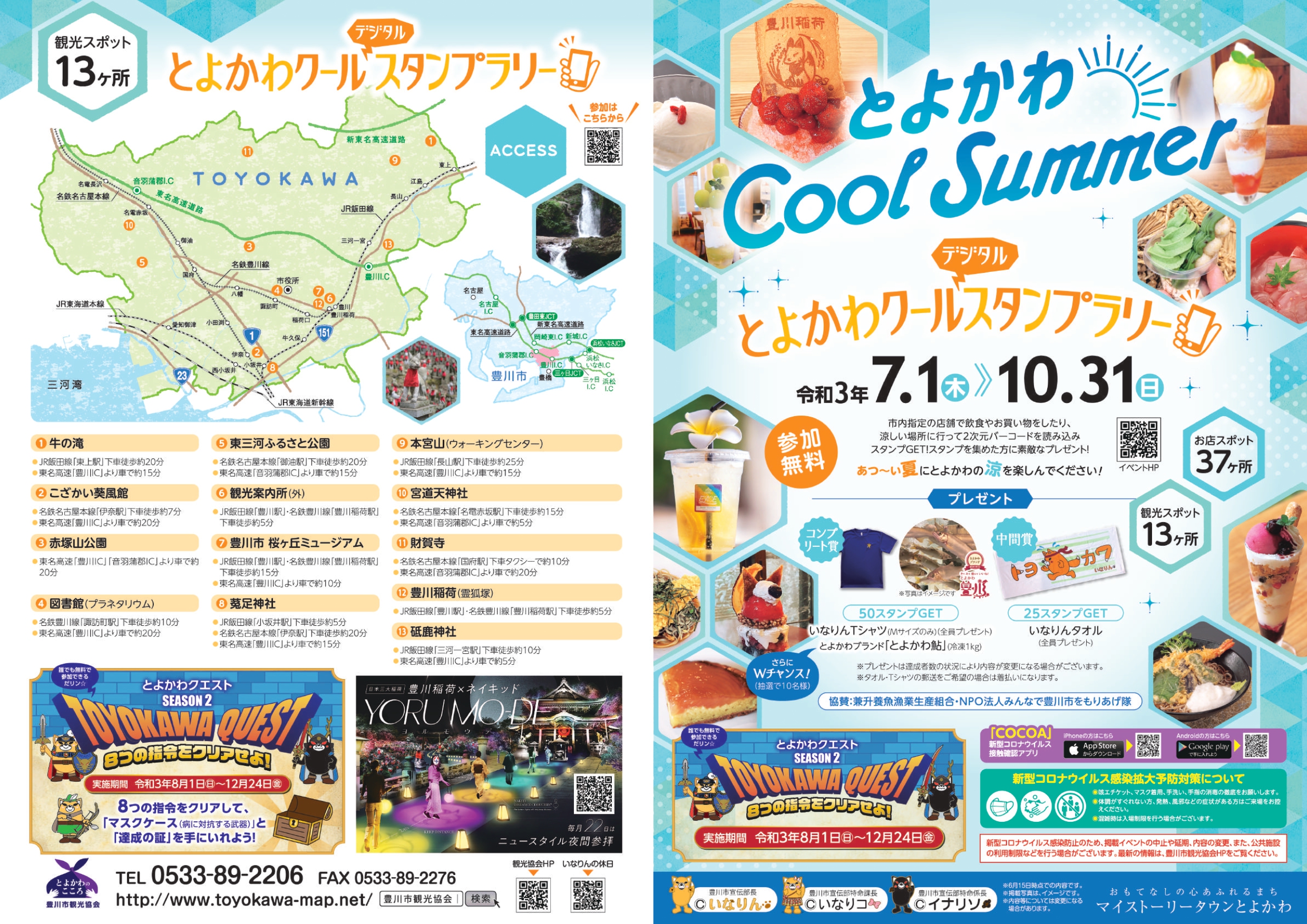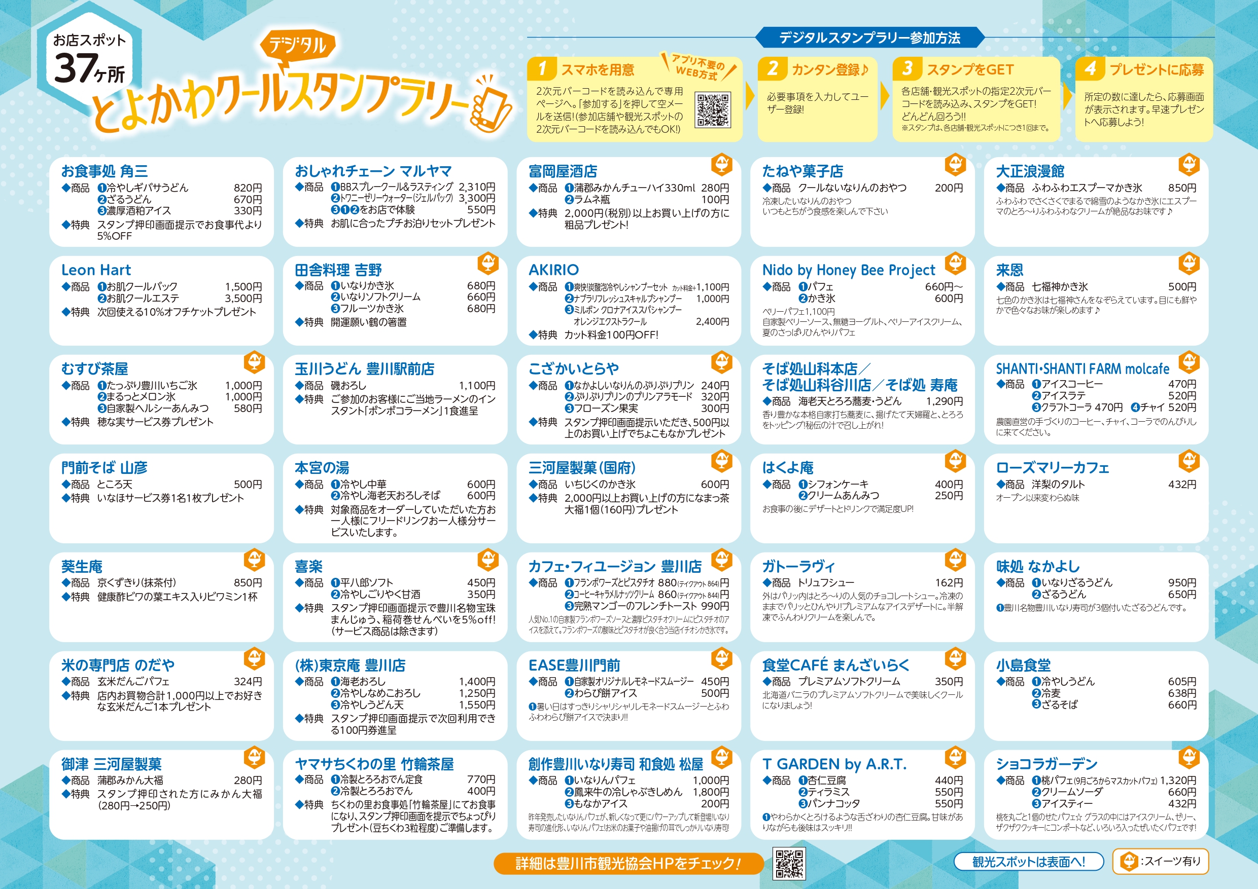 豊川市内会員店舗37ヵ所と、観光スポット13ヵ所をスマホやタブレット片手に巡るデジタルスタンプラリーです!市内指定店舗で飲食やお買い物をしたり、涼しい場所に行って2次元バーコードを読み込みスタンプGET!スタンプを集めた方全員に素敵なプレゼントも!