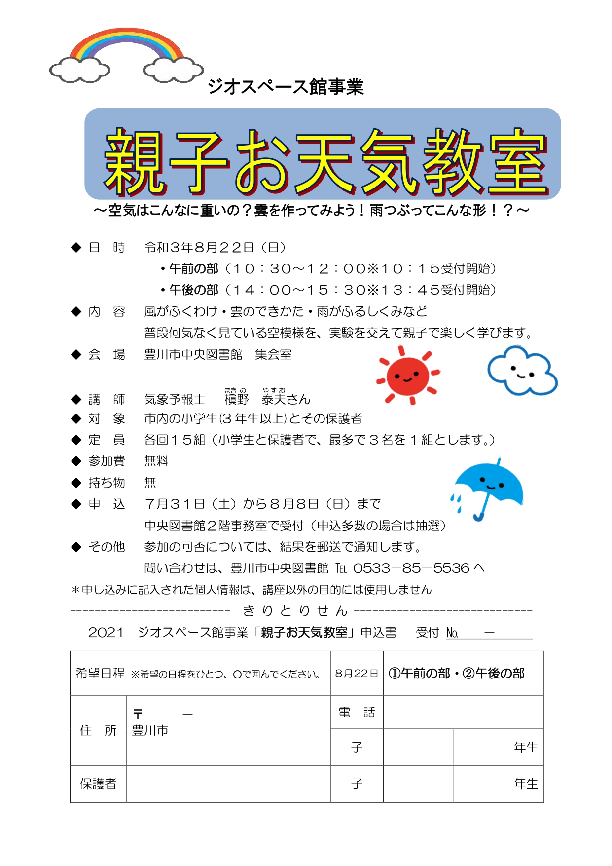 | 定員 | 各回15組(小学生と保護者で、最多で3名を1組とします。) |