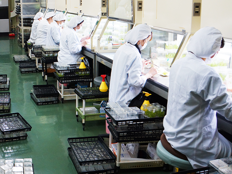 弊社は、農家の方々から苗づくりをお任せいただき、良質な苗のコピーを大量に生産します。農家の方々は苗づくりを分業できることで労働負担が減り、かつ、病気のない若返り効果を持つ苗を利用することで品質の向上や安定生産を可能とします。