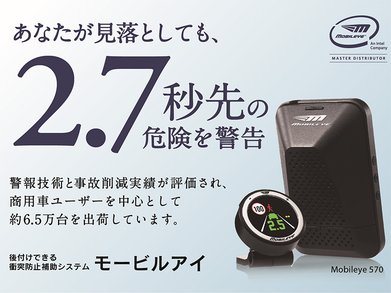 タクシーやトラック、バス、営業車など幅広い車両に装着でき、ドライバーに対して最適なタイミングで警報音とアイコン表示による注意喚起を行います。これまでに約7万台の販売実績があり、Mobileye搭載車両では平均88%の前方追突事故削減が実現しています。