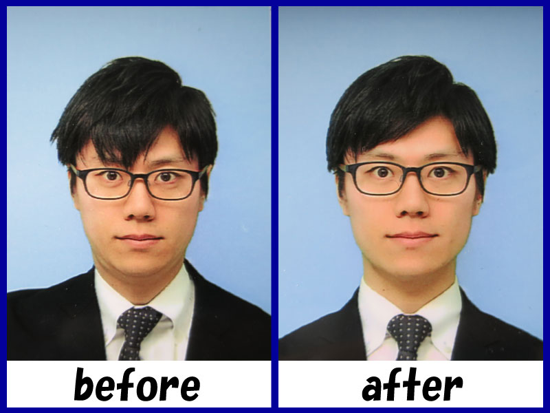 一方で、afterは清潔感、明るさを感じさせる写りの良い証明写真に仕上がっています。