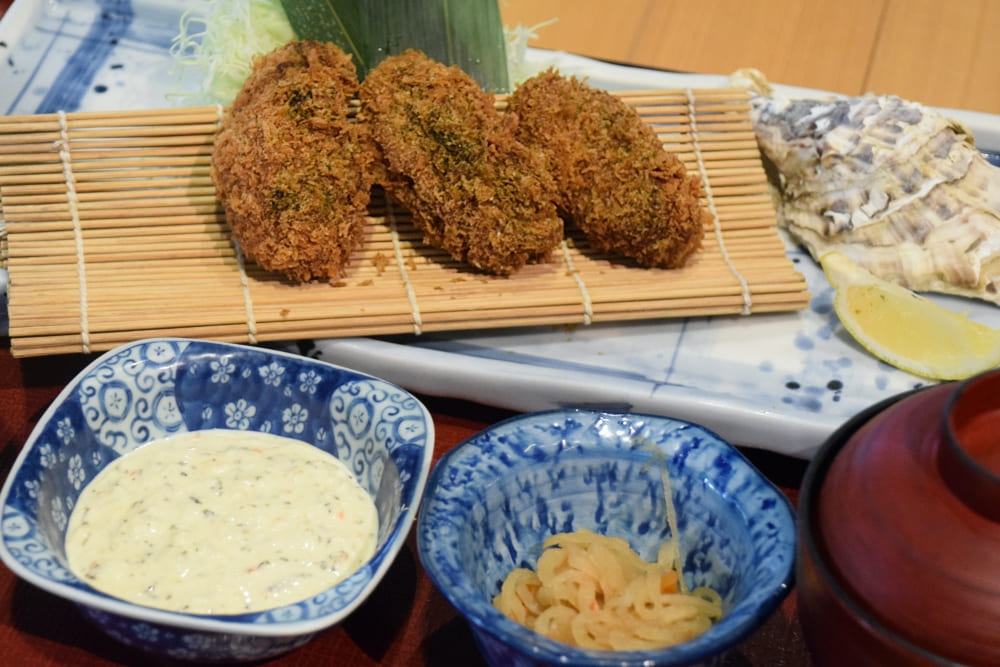 和食の専門店武蔵 総本店が旬の牡蠣と大葉加工品を使用した “大葉づくし” のカキフライ定食。粉末の大葉をフライの衣に使用し風味よく、専用のタルタルソースには柚子胡椒ならぬ大葉胡椒を使用しています。