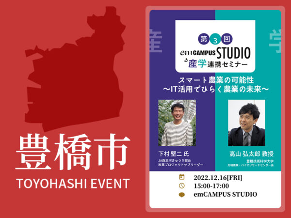今回の産学連携セミナーでは、エンジニアのキャリアを持ち、現在は西三河のきゅうり農家として活躍されている下村堅二氏と、豊橋技術科大学先端農業・バイオリサーチセンター長として、植物工場の高度化に向けて尽力されている高山教授を招き、それぞれの視点からスマート農業の可能性について議論を深めます。