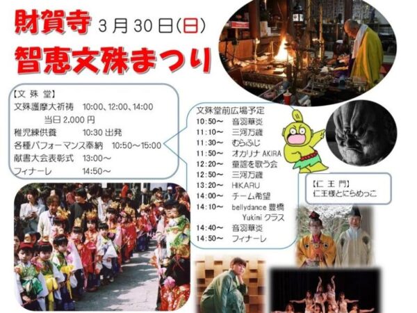 境内の文殊堂にまつられる「文殊菩薩」は、智恵文殊として有名で、学問成就の願かけに遠近の人達で賑わいます。 文殊護摩大祈祷、稚児練供養、書道パフォーマンス、各種奉納、大筆書き大会、仁王さま展望台、第64回智恵文殊菩薩献書大…