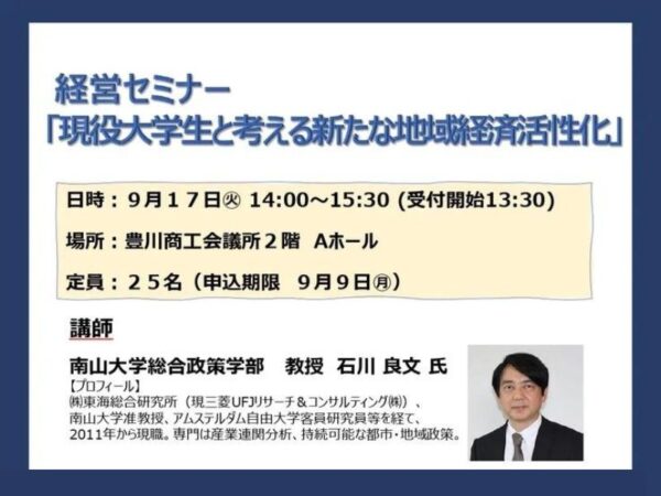 豊川市では、地域経済循環(※)を促進し地域住民の生活環境を維持しつつ地域商業の活性化を図ることを目的とした経営セミナーを開催します。 令和6年度は、人の呼び込むための活性化策を、現役大学生を交えて提案していくワークシ…