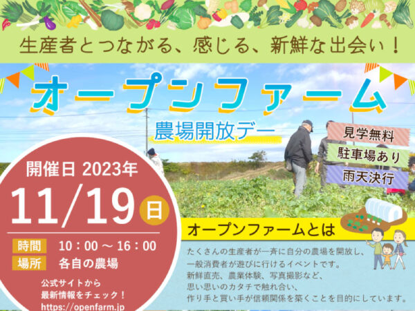オープンファームとは たくさんの生産者が一斉に自分の農場を開放し、一般消費者が遊びに行けるイベントです。 新鮮直売、農業体験、写真撮影など、思い思いのカタチで触れ合い、作り手と買い手が信頼関係を築くことを目的にしています…