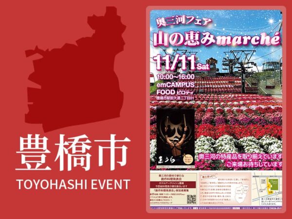 奥三河地域の特産品や体験が集まる「奥三河フェア山の恵みmarché(マルシェ)」がemCAMPUS(エムキャンパス) FOOD(フード) にて開催されます。 ホテルアークリッシュ豊橋の今里総料理長による創作料理発表会や「…