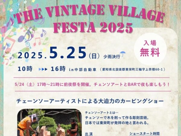 チェーンソーアーティストによる大迫力のカービングショーや美味しいグルメ、素敵な音楽も♪ 東栄町三輪地区にある中部自動車さんにて【THE VINTAGE VILLAGE FESTA 2025】が開催されます! …