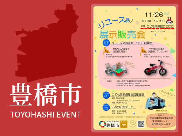 「リサイクル工房」で再生したおもちゃや家具、自転車を展示・販売します。おもちゃや家具は抽選で当選された方に100円または500円で販売、自転車は抽選で当選された方に無料でプレゼントします。他にもごみ分別ゲームやこども電動収集車によるごみ収集体験等、お子様向けの企画も用意しています。