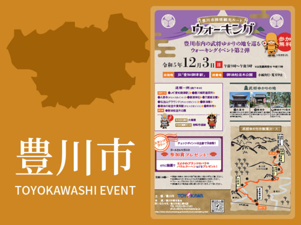 豊川市推奨観光ルートウォーキングは、チェックポイントでスタンプを集めてゴールを目指すウォーキングイベントです。 今回は、大河ドラマ「どうする家康」に合わせて、豊川市内の武将ゆかりの地を巡ります。 開催日 2023年12月…