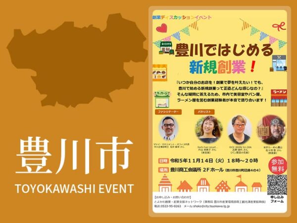 豊川ではじめる新規創業 「豊川ではじめる新規創業」をテーマにした創業ディスカッションイベントを開催します。 『いつか自分のお店を!創業で夢をかなえたい!でも、豊川で始める新規創業って、正直どんな感じなの?』 そんな疑問に…
