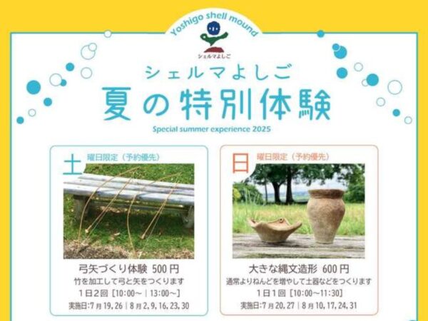 弓矢づくり体験や大きな縄文造形といった土日限定の体験があるほか、大きなまが玉づくりや縄文ガチャなど期間中いつでも体験できる内容もあります。 事前予約が必要なものもありますので、詳細ページからご確認ください。 …